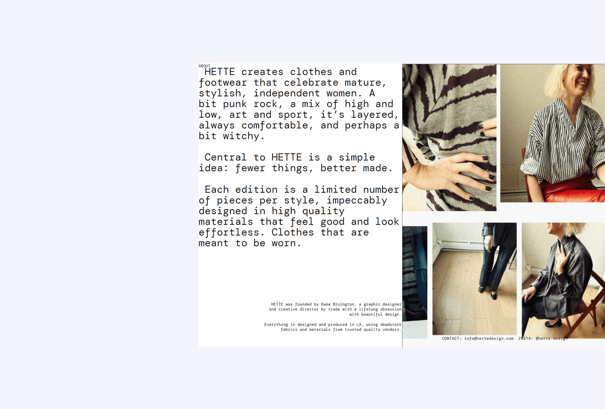 THE WORK Everything. Brand strategy, naming, visual identity, and the design of the first pilot collection, limited edition clothing and footwear built around craft, material quality, and the rejection of trend-driven fashion cycles. HETTE doesn't operate on a seasonal calendar. Instead, work is released in small pilots, focused editions made when they're ready, not when the industry says so. All pieces are designed and produced locally in LA using deadstock fabrics, collaborative materials, and trusted quality vendors.