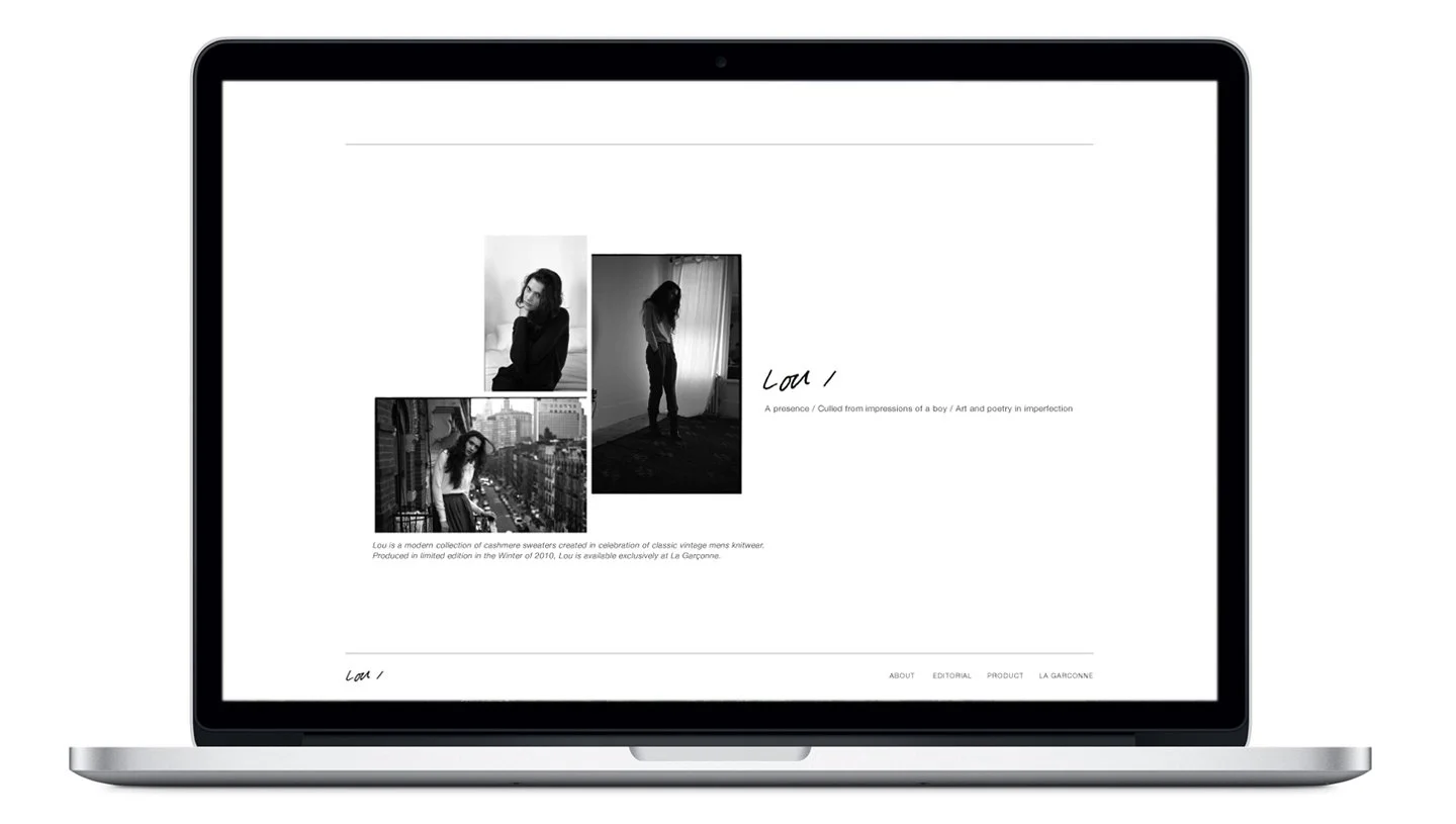 THE WORK A range of projects spanning seasonal editorial, digital landing pages, and brand identity — including art direction for the Fall/Winter editorial, the online launch campaign for La Garçonne's first in-house line LOU, and various landing page imagery. Work that required equal parts editorial sensibility and commercial precision.